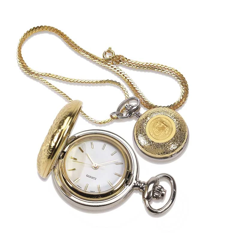 Gold-plated case & 24 inch chain, 1 inch in diameter case, quartz movement