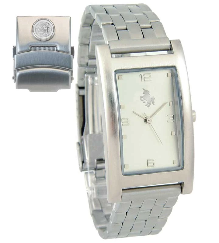 Stylish rectangular watch with a silver-tone face and raised markers. Silver-tone metal bracelet and stainless steel case back.
