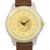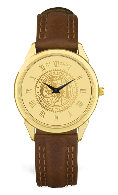 Gold ION-plated wristwatch with padded, brown leather strap. 3 ATM water resistant case, engravable.