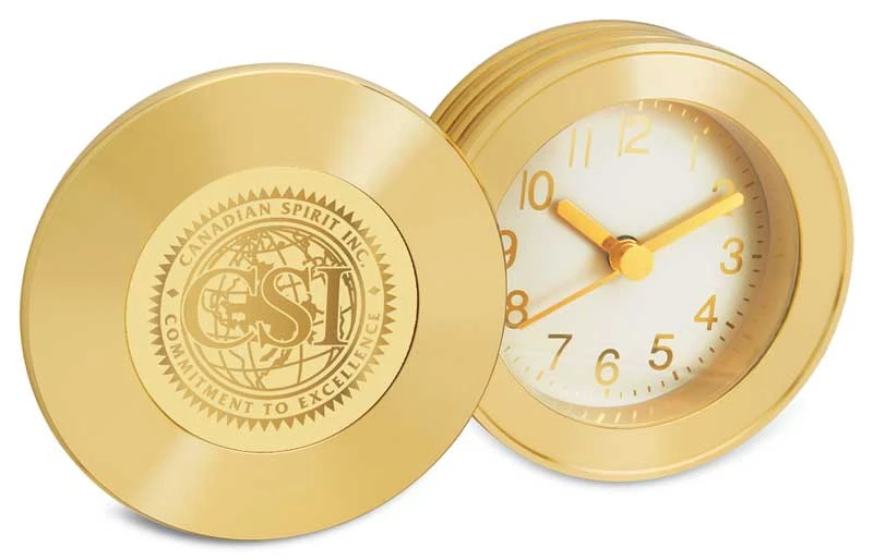 Rodeo gold-plated desk clock with fold-over medallion cover plate