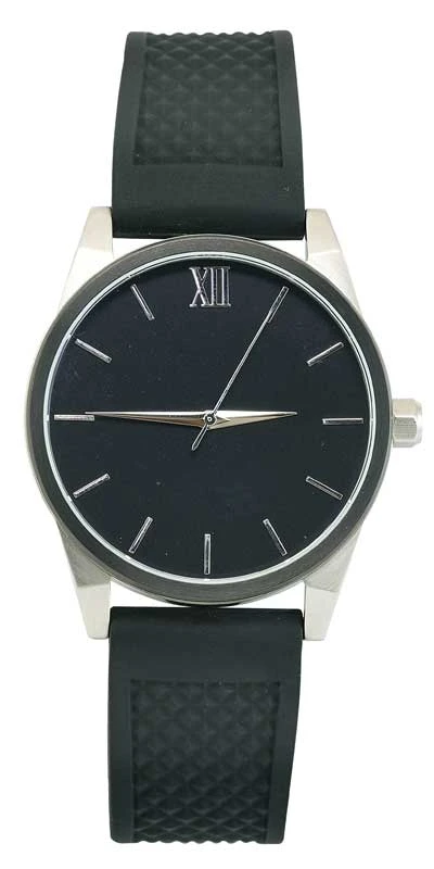 Two-tone stainless steel wristwatch with black silicone strap. 5 ATM water resistant. Engravable.