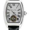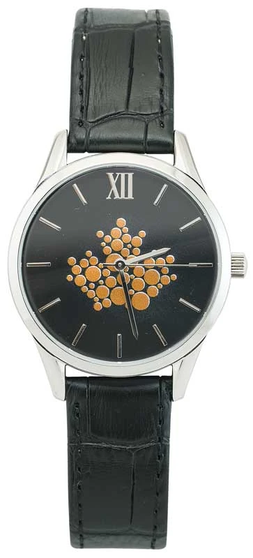 Stainless steel wristwatch with black leather strap. 5 ATM water resistant. Engravable.