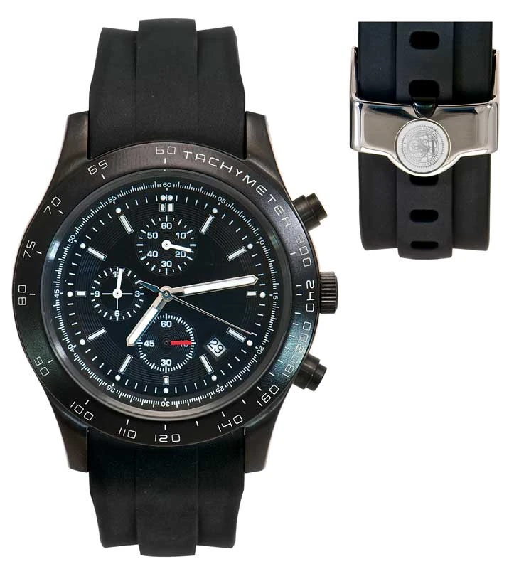 Six hands chronograph, water resistant to 100m, black PU rubber strap.
