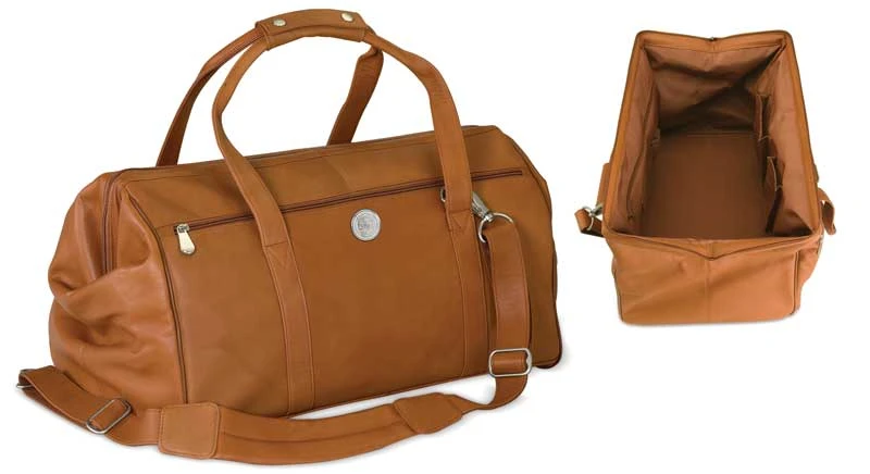 Wide jaw bag. Two outer full length zippered pockets. HD microfiber lining, pen, business card, cell pockets and padded strap. Full grain tan aniline cowhide.