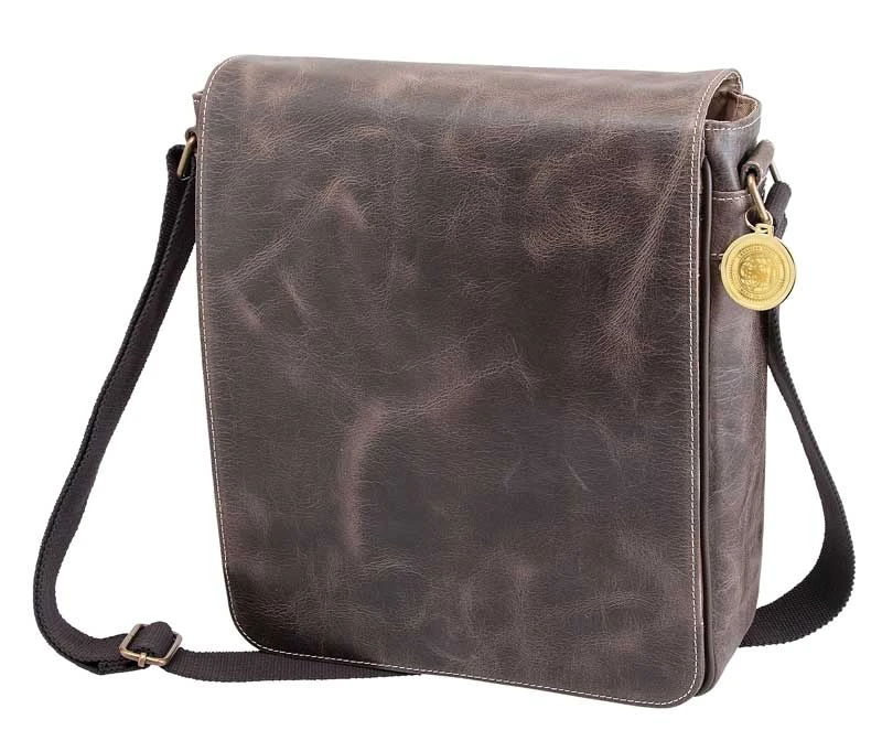 Full grain destressed water buffalo tanned leather. Can hold small standard laptop and /or tablet. Flapover cover has magnetic closure, extra inside pockets, cotton canvas lining. Adjustable shoulder strap incuded.