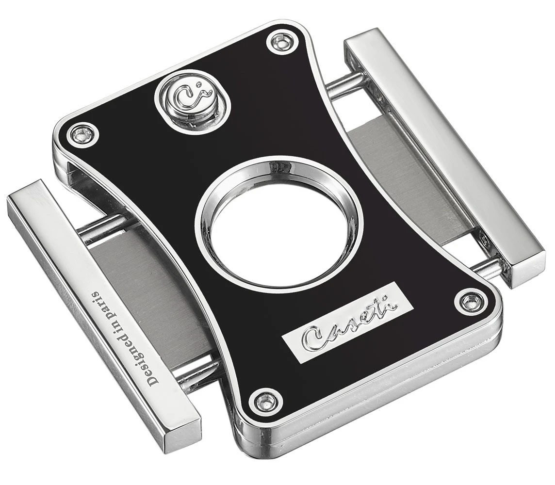 This black Caseti cigar cutter is sure to impress with its sleek modern design and double guillotine blades. Made of premium quality stainless steel, this cutter will handle all your cigar cutting needs. When you are ready to light up, simply insert your cigar and press the two bars on either side for a precise, clean cut time and time again. Slide button up for the cutter’s spring action mechanism to open the cutter. Place the cigar cap in the ring hold and push the two bars in at the same time for a clean cut of the cigar. Cuts up to 52 ring gauge cigars. Premium Quality; Comes in an attractive gift Caseti branded gift box. Designed in Paris. We also sell the leather pouch that this cutter would fit in.