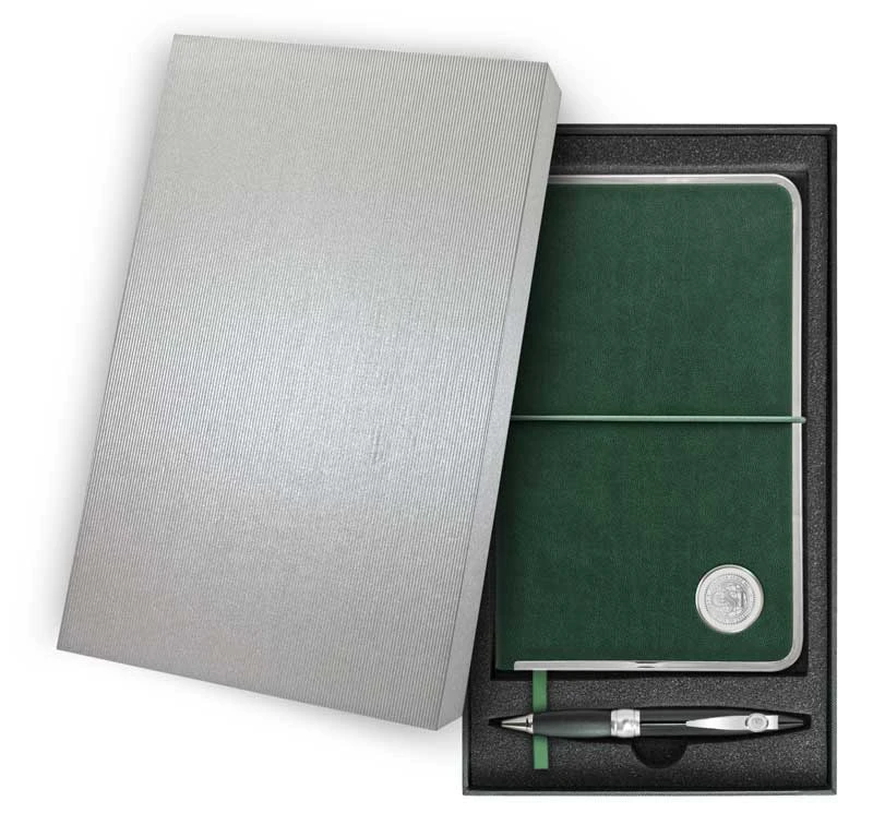 Green vinyl hard cover journal and Ambassador pen gift set. Journal features: silver trim, ribbon page marker, 194 lined pages.