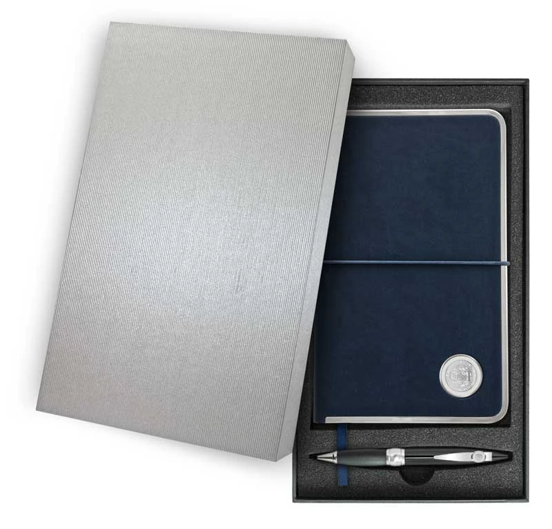 Navy vinyl hard cover journal and Ambassador pen gift set. Journal features: silver trim, ribbon page marker, 194 lined pages.