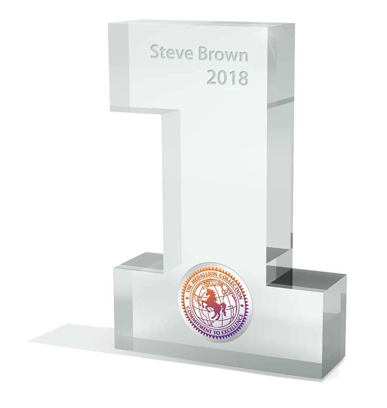 Acrylic numeral 1 celebration award with medallion and space for personalized engraving.