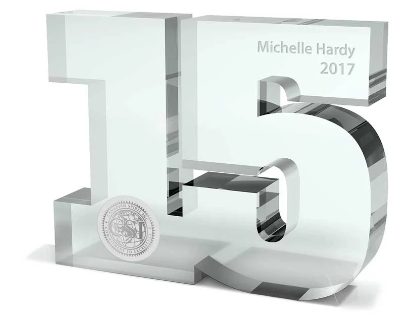 Acrylic numeral 15 celebration award with medallion and space for personalized engraving.