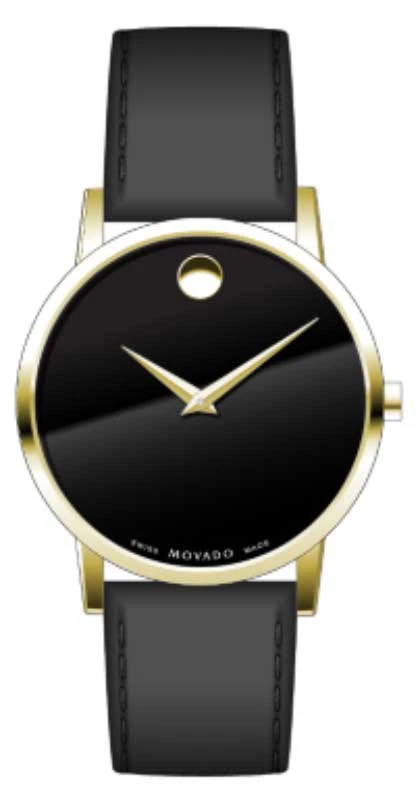 Movado men’s Museum Classic watch. 40 mm yellow gold PVD case. Black Museum dial with tone-on-tone outer ring and silver-toned dot and hands. Black calfskin strap with yellow gold PVD classic tongue buckle. Sapphire crystal. Swiss quartz movement. Water resistant to 30 meters.