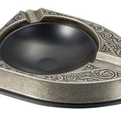 This large metal ashtray features celtic vine designs and an extra large basin for those nights with your pals, and the basin can keep up with even the most efficent cigar connosurs. Featuring three cigar rests, you should always have a place to set your favorite cigar between puffs and the Albion even comes in a stylish display box so you can show it off even when not on the table. Brushed Metallic Silver with Black Finish; Celtic Vine Relief Designs Solid Metal Construction; Wide Deep Basin with Matte Black Finish 6.7 x 4.6 x 1.4 inches; 4 inch diameter basin; 1.3 pounds Three Cigar Rests on Each Corner of the Ashtray An excellent desktop or smoke room addition for your own personal use or small gatherings, the three cigar rests allow you to perform other activates while enjoying your favorite cigar; Comes in Stylish Display Box