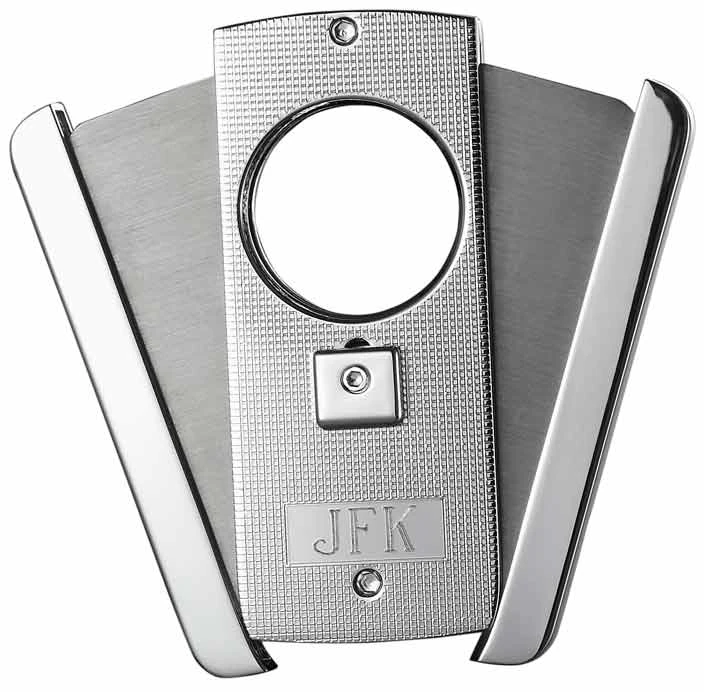 Get blown away by the handsome and sleek design and super sharp blades of the Visol Axe High Polish Stainless Steel Cigar Cutter. A must-have cigar accessory and a great gift for cigar aficionados, this cutter features dual guillotine blades constructed from high quality stainless steel that can cut/ slice the cap off a cigar up to a 56 ring gauge with precision. The button positioned in the center front once pressed opens up the cigar cutter and releases and reveals the blades. With a high polish silver accentuated with a texture design gives it a suave and debonair look adds to your natural appeal. Below the button is a small place that is reserved for engravings. Personalize it with letterings of your choice in Roman Block or Roman Monogram fonts; for free! Packaged in Attractive Gift Box with Visol logo, it comes with a velvet pouch.