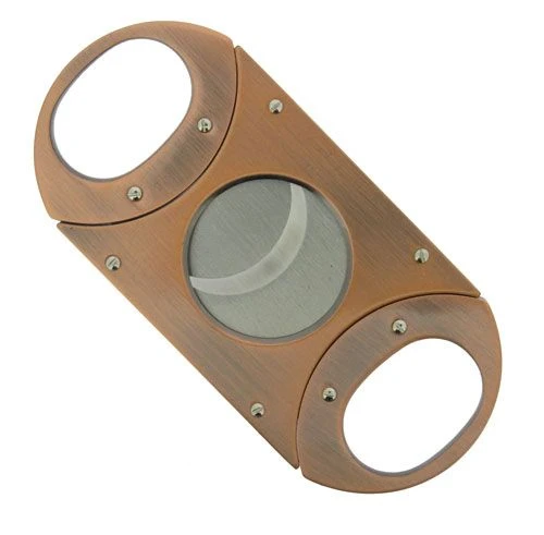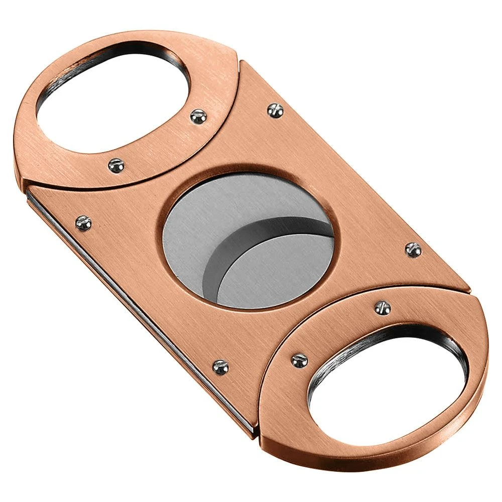 Cut your cigars to perfection with the Balboa from Visol! One of our most popular cigar cutters is now available in a new style. Sleek in copper, the Balboa stands out with its brushed copper finish accented with visible stainless steel screws adding to its masculine design. The cigar cutter features dual guillotine blades ready to slice down on cigars up to a 56 ring gauge. Lightweight and customizable, personalize the Balboa with an initials for you or a gift for friends or family today at eLighters! Dimensions: Height : 3.35 inches Width : 1.61 inches Weight: 2.11oz Cuts Up To 56 Ring Gauge Superb Quality Stainless Steel Two Guillotine Blades Copper Finish One line of Free Engraving is offered on this premium quality cigar cutter.