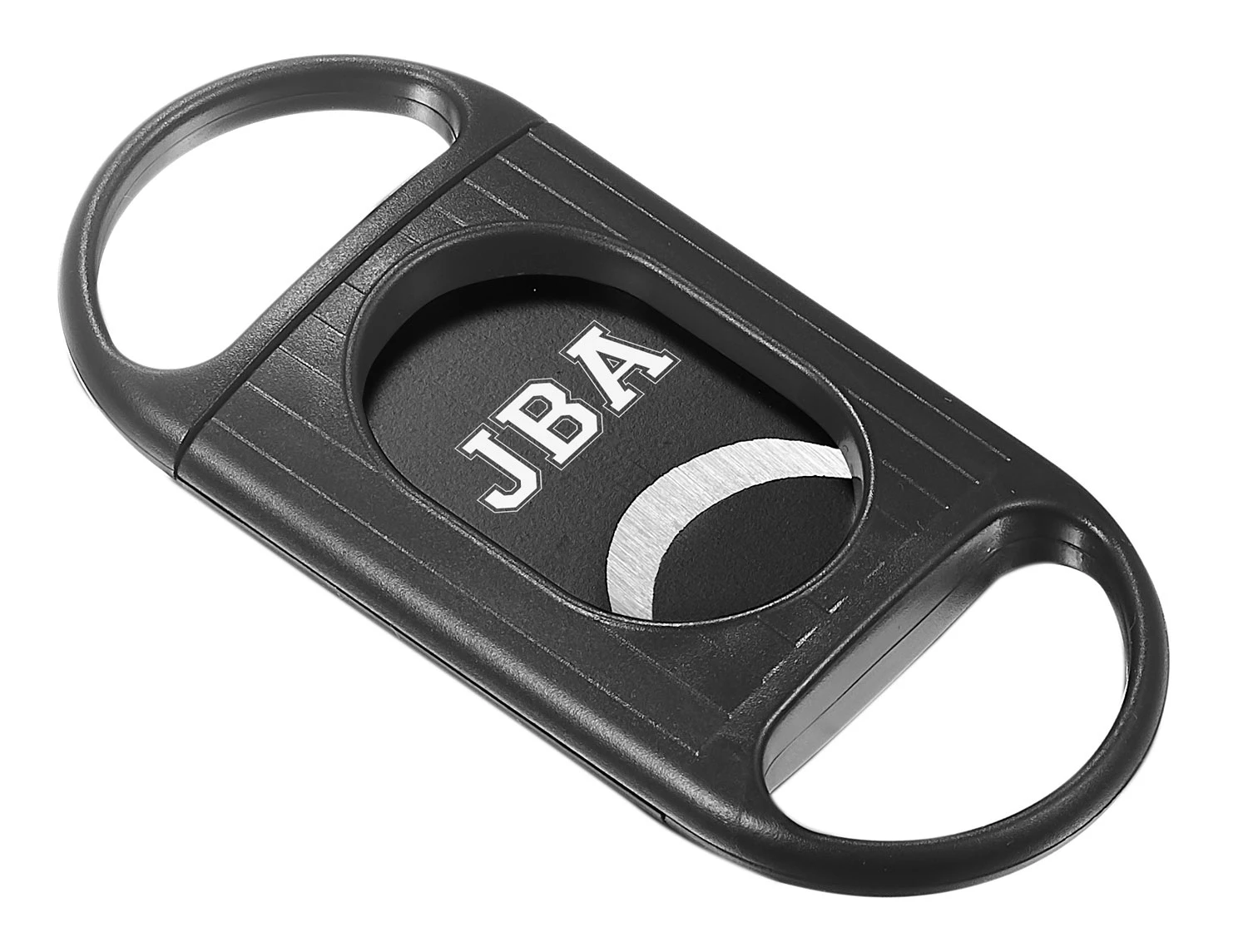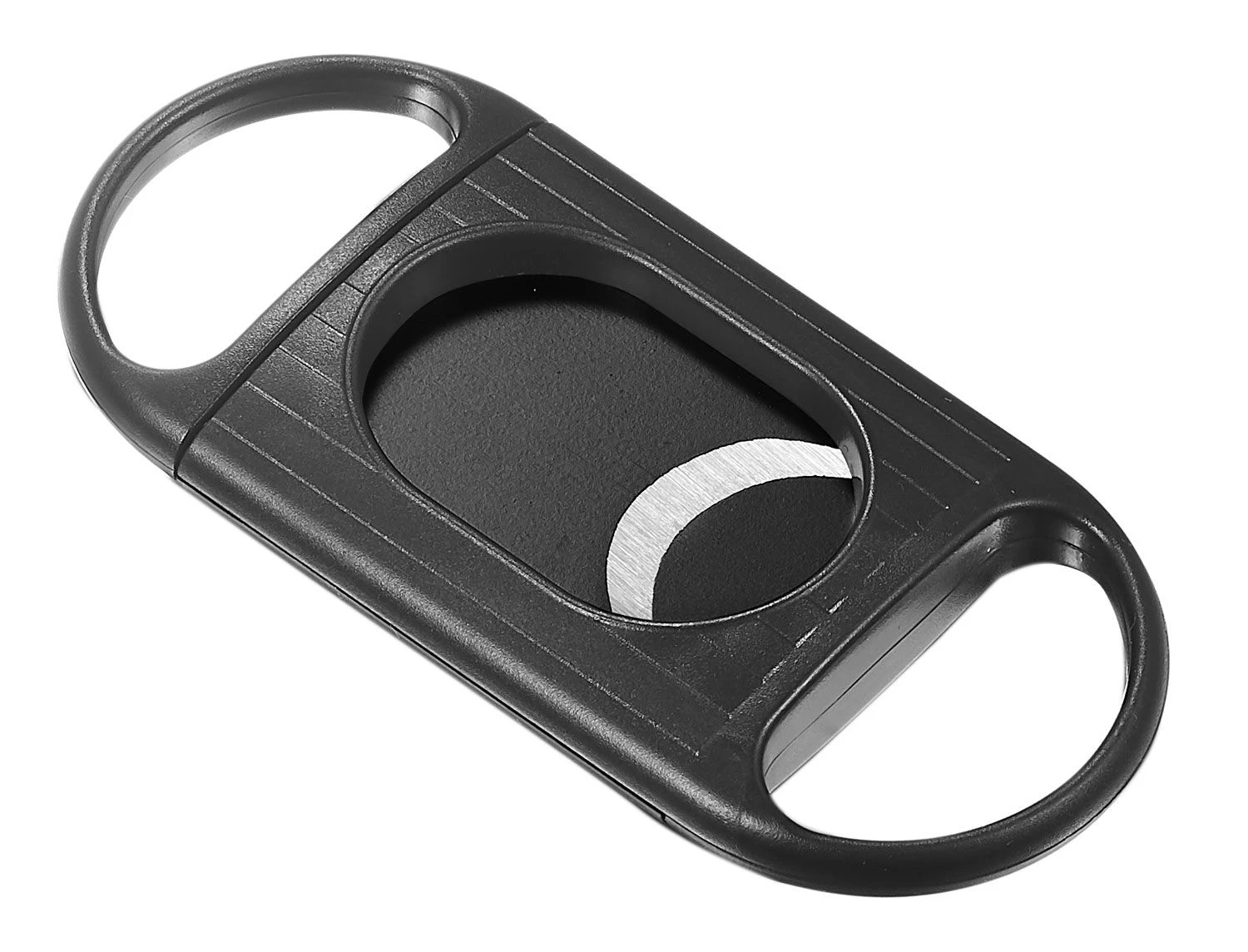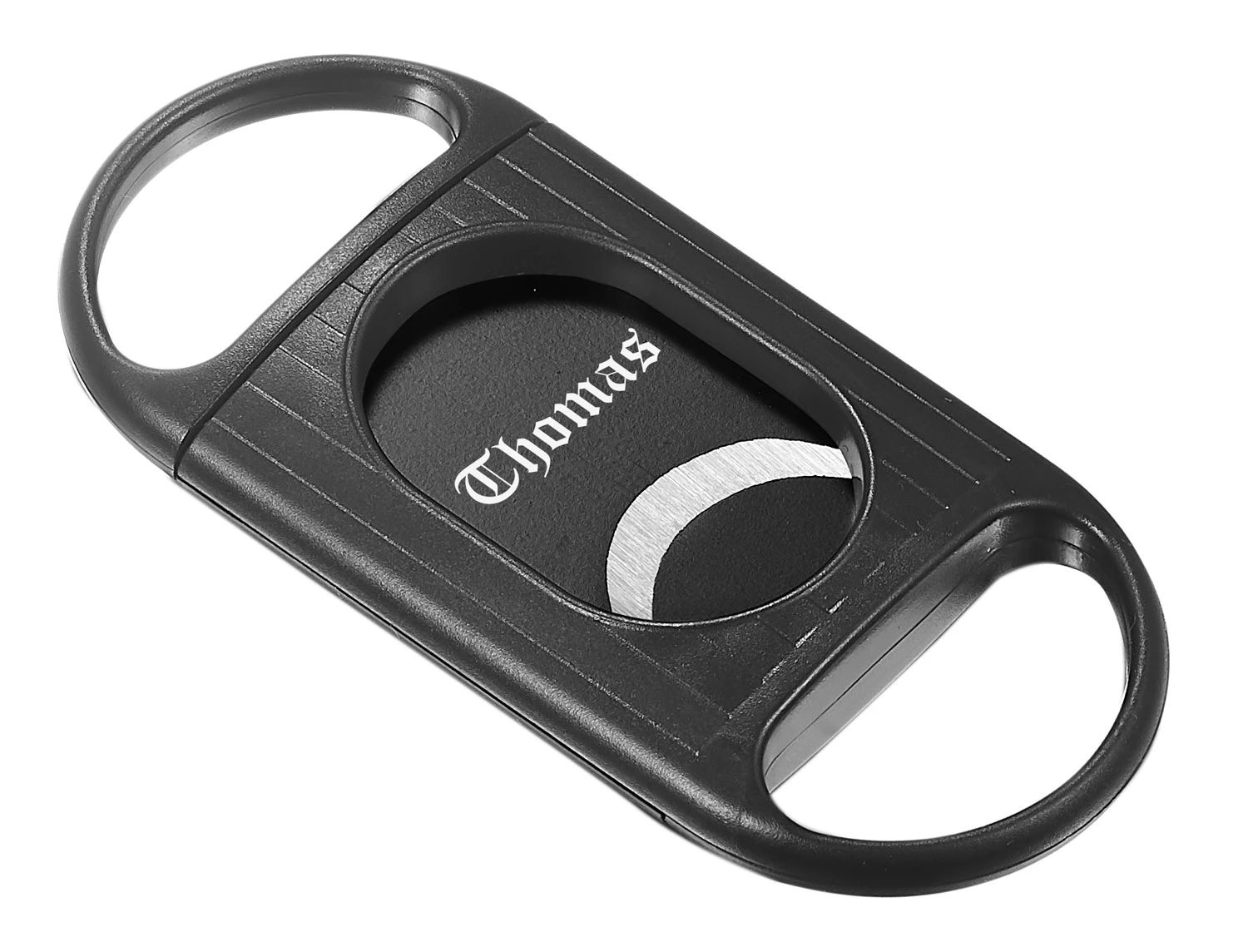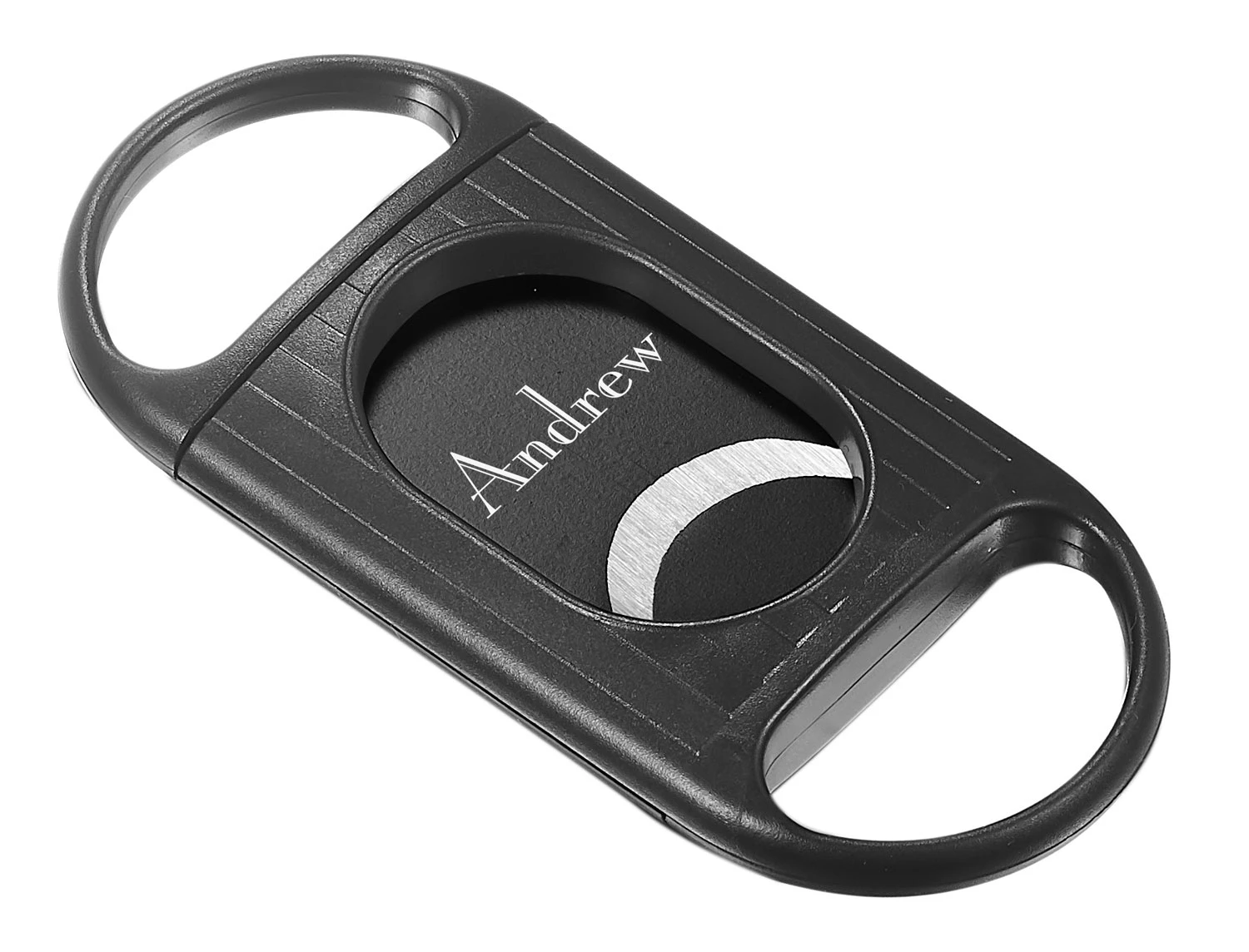 This extra large plastic cigar cutter is perfect for your larger cigars, able to easily slide into the wide opening and cleanly cut your favorite cigar. The black blade allows the engraving to really stand out!
