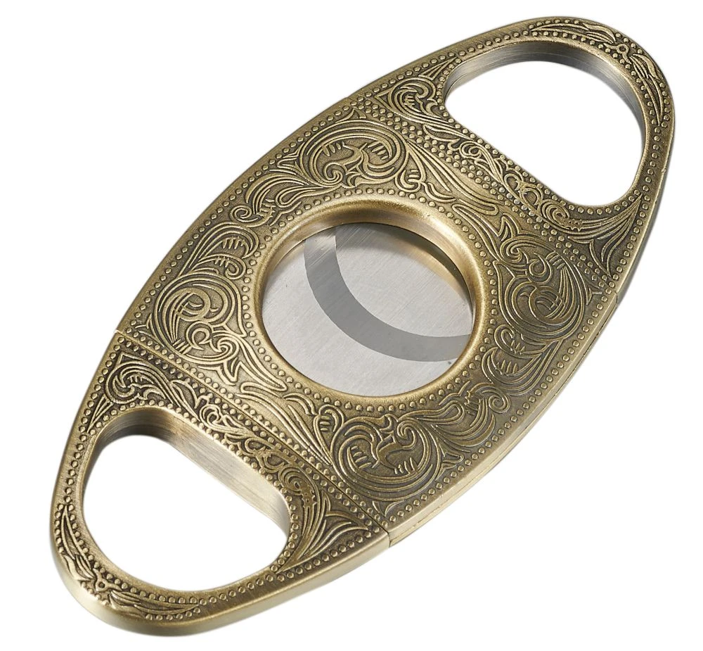 Calling back to an era that saw some of the most fantastic metalwork ever produced in that century, this Wild West Cigar Cutter features an intricate pattern of swirling ridges and rounded dots over a distressed black undercoat to produce a truly impressive cigar cutter. The paired blades slide out with ease so as to produce the best possible cut for your favorite cigar anytime and every time Features traditional stamped metalwork style of the Wild West era of US History, and an antique gold finish to really make the details pop Dual Bladed Razor Sharp Double Guillotine Cigar Cutter Cuts up to 56 Ring Gauge Cigars Approximate Dimensions: 3.6 by 1.5 inches Slide Handles Apart for Easy Access Cutting Action