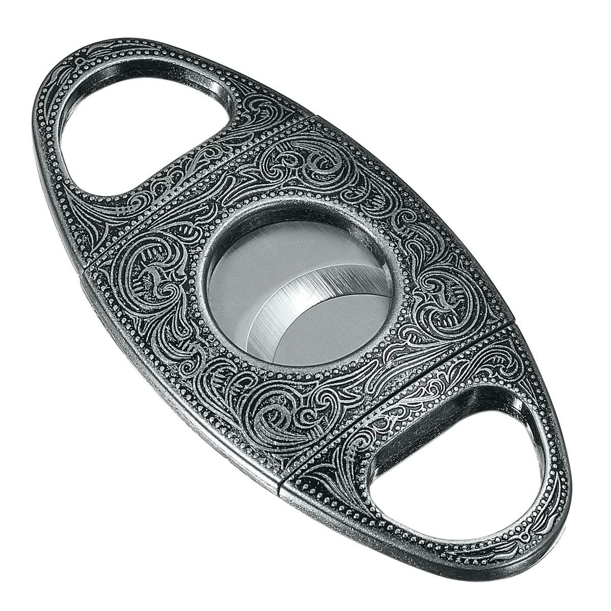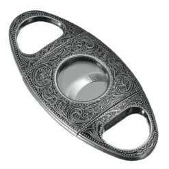 Calling back to an era that saw some of the most fantastic metalwork ever produced in that century, this Wild West Cigar Cutter features an intricate pattern of swirling ridges and rounded dots over a distressed black undercoat to produce a truly impressive cigar cutter. The paired blades slide out with ease so as to produce the best possible cut for your favorite cigar anytime and every time Features traditional stamped metalwork style of the Wild West era of US History, and a rugged black finish to really make the details pop Dual Bladed Razor Sharp Double Guillotine Cigar Cutter Cuts up to 56 Ring Gauge Cigars Approximate Dimensions: 3.6 by 1.5 inches Slide Handles Apart for Easy Access Cutting Action
